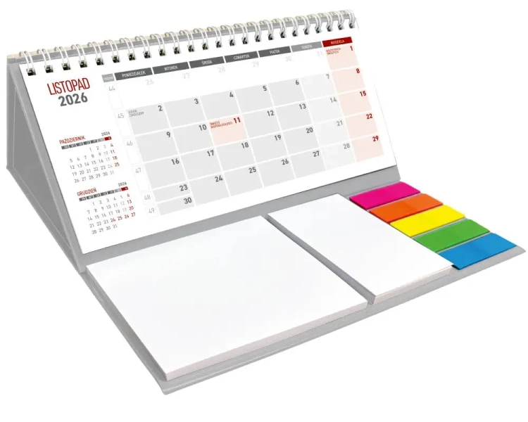• Kalendarium 2026 • Miesiąc bieżący, poprzedni i następny • Daty świąt • Samoprzylepne kartki do notowania • Kolorowe znaczniki