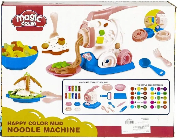 Zestaw kreatywny marki Happy Kiddo zawiera maszynkę do makaronu oraz 10 pojemników z ciastoliną (po 25g), umożliwiając dzieciom tworzenie różnych kształtów makaronów i potraw. W komplecie znajduje się łącznie 24 elementy, w tym 4 wymienne nakładki do maszynki, sztućce, talerzyk, miseczka, wałki i foremki, które wspierają rozwój zdolności manualnych i koordynacji wzrokowo-ruchowej.