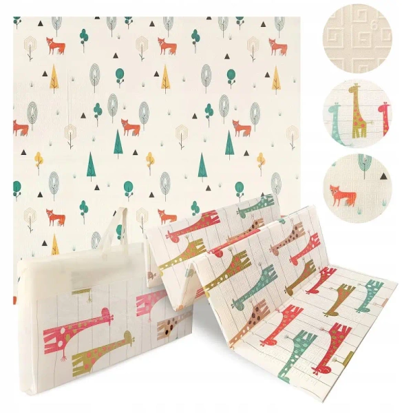 Mata piankowa o dużej powierzchni i dwóch stronach z różnymi, bajkowymi wzorami to praktyczne i estetyczne rozwiązanie do każdego dziecięcego pokoju. Dwustronny nadruk jedna strona z kolorowymi żyrafami, druga z lisami i drzewkami