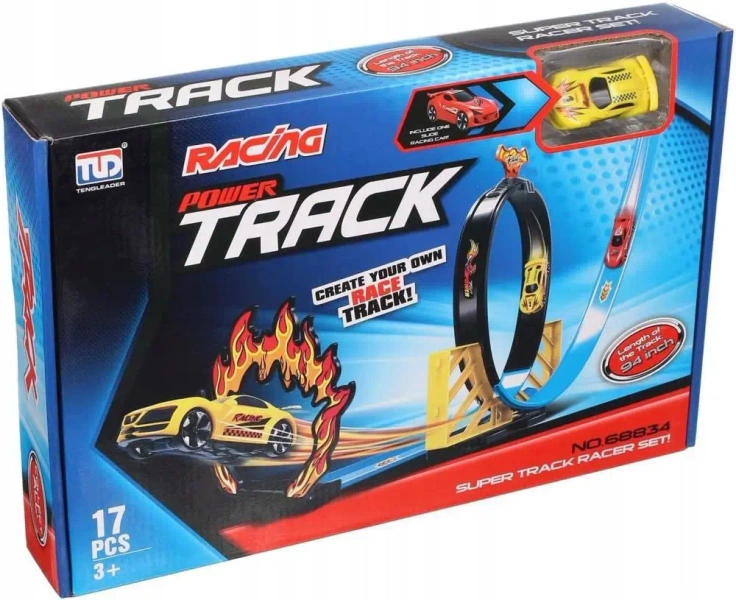 W zestawie znajduje się aż 17 elementów, w tym jedno autko wyścigowe, które z łatwością pokonuje zakręty i pętlę.