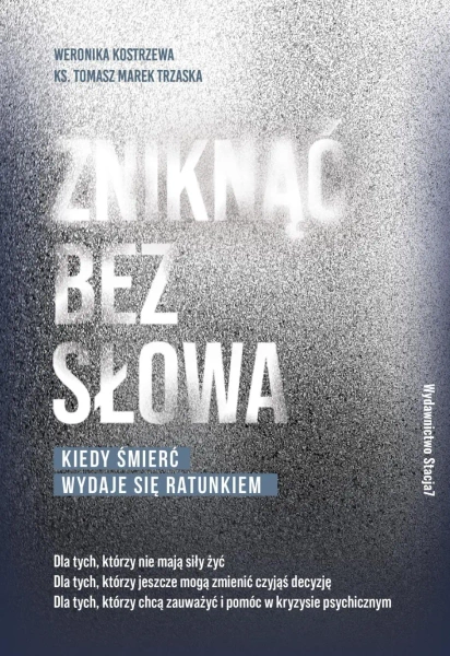Książka ZNIKNĄĆ BEZ SŁOWA to przewodnik dla tych, którzy dotknęli kryzysu samobójczego i chcą wiedzieć, jak pomóc sobie i innym. Powstała z myślą o każdej osobie, która ma szansę wpłynąć na decyzję swoją, swoich bliskich i osób w otoczeniu.