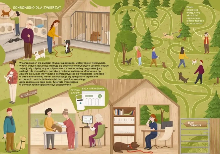 Lekarze i lekarki weterynarii kochają zwierzęta: badają je, leczą, operują, szczepią, ćwiczą z nimi, pomagają im w przyjściu na świat Pracują w małych gabinetach, wielkich klinikach, schroniskach dla zwierząt, ośrodkach rehabilitacji, laboratoriach i wielu innych miejscach. A kiedy trzeba, odwiedzają pacjentów w ich domach - zawsze gotowi do niesienia pomocy!