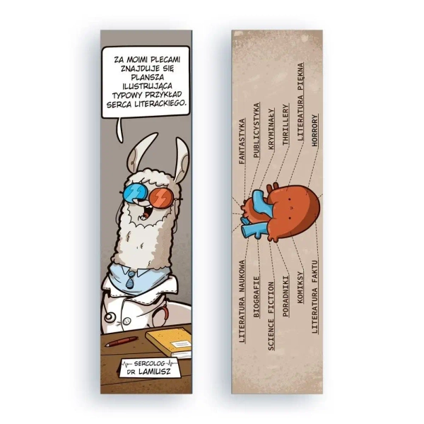 Na podstawie wnikliwej obserwacji widocznych symptomów, Doktor Lamiusz zdiagnozował u Ciebie literackie serce. To odkryta niedawno jednostka chorobowa, która objawia się niepohamowaną miłością do książek. Na szczęście nie wynaleziono na nią lekarstwa i nikt nawet nie podejmuje tak niedorzecznych prób. Czytaj i korzystaj z pięknych zakładek - na zdrowie! Karton ozdobny perłowy 300g, sztywny, metaliczno-srebrny połysk Wymiary: 50x200mm
