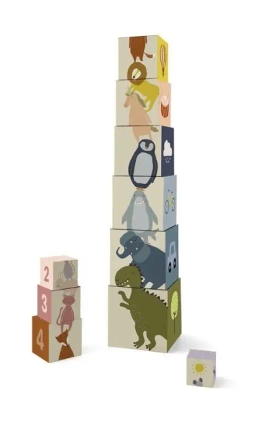 Zabawa, nauka i odkrywanie - wszystko w jednym! Ten zestaw 10 kolorowych klocków zapewni maluchowi długie godziny radosnej aktywności. Każda ścianka klocka to nowa niespodzianka - zwierzaki, liczby, przedmioty i obrazki do układania w formie prostych puzzli. Dzięki różnorodnym motywom dziecko może: budować wysoką wieżę, dopasowywać wielkości, rozpoznawać kolory i liczby, układać ilustracje i poznawać zwierzątka. Klocki zostały wykonane z wytrzymałego kartonu z certyfikatem FSC(R) oraz nadrukowane bezpiecznym tuszem sojowym i zabezpieczone wodnym lakierem - bezpieczne i ekologiczne. Wiek: 12 miesięcy+ Materiał: Karton FSC(R), tusz sojowy, wodny lakier