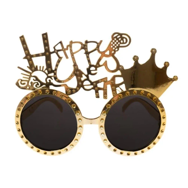 Zabawne okulary sylwestrowe z napisem "Happy New Year" w ich górnej części. Doskonały dodatek na imprezy sylwestrowe oraz zabawy karnawałowe. Produkt wykonany z tworzywa sztucznego. Wymiary okularów: 15 x 11,5 cm.