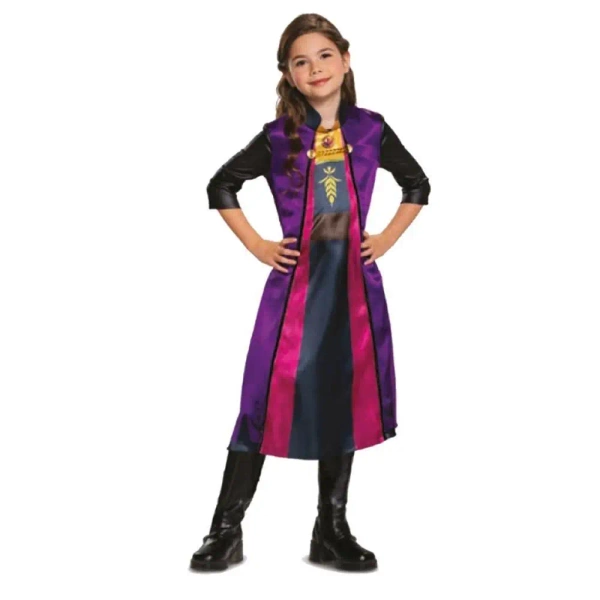 Strój dziecięcy bohaterki bajki "Frozen" - Anny. Sukienka z rękawami 3/4. Sukienka jednolita, imituje pełny strój. W okolicy obojczyków posiada ozdobny sznureczek łączący strony. Uniwersalny strój dla dziewczynki na bal przebierańców, zabawę karnawałową, urodziny. Strój w rozmiarze M. Pasuje na wzrost 124 - 135 cm.