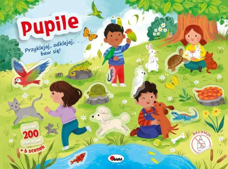 Pupile z serii „Przyklejaj, odklejaj, baw się!” to urocza książeczka z naklejkami wielokrotnego użytku, która zabierze maluchy do świata domowych zwierząt. W środku znajdują się barwne ilustracje oraz zestaw naklejek przedstawiających psy, koty, króliczki i inne pupile, które można przyklejać i odklejać wielokrotnie – zarówno w książeczce, jak i na innych powierzchniach.