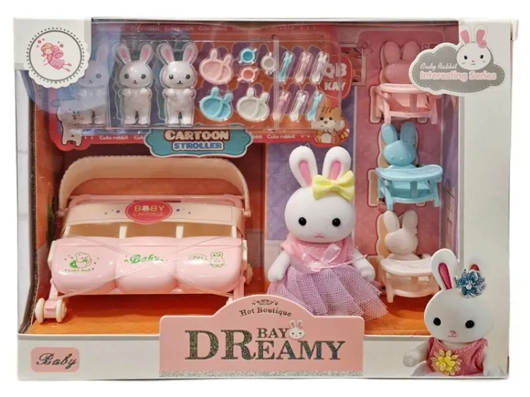 Zestaw Baby Dreamy z króliczkiem i akcesoriami do zabawy. W komplecie figurka króliczka, wózek, mebelki i dodatkowe elementy. Zapakowany w kartonowe pudełko. Zabawka przeznaczona dla dzieci od lat 3. Wymiary opakowania są wymiarami pudełka.