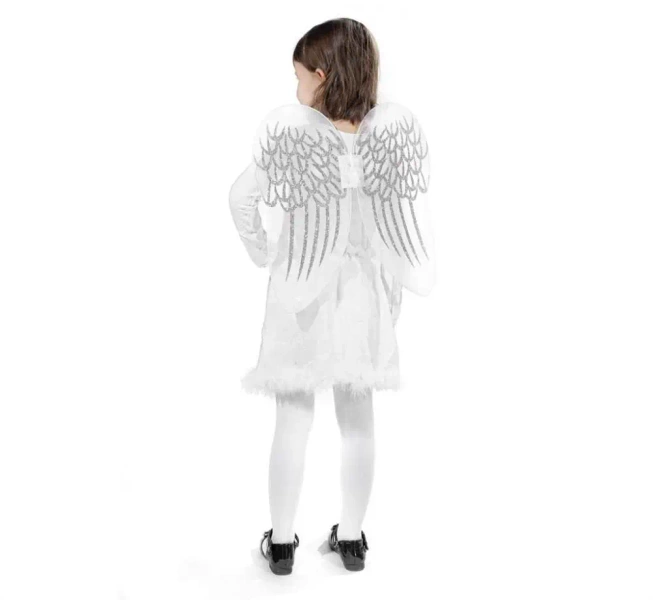 Skrzydła ANIOŁA dla dzieci Wymiary: Długość: 37 cm Szerokość: 45.5 cm Skrzydełka wykonane z białej cienkiej siateczki, zdobionej srebrnym brokatem. Są mocowane za pomocą białych elastycznych gumek.