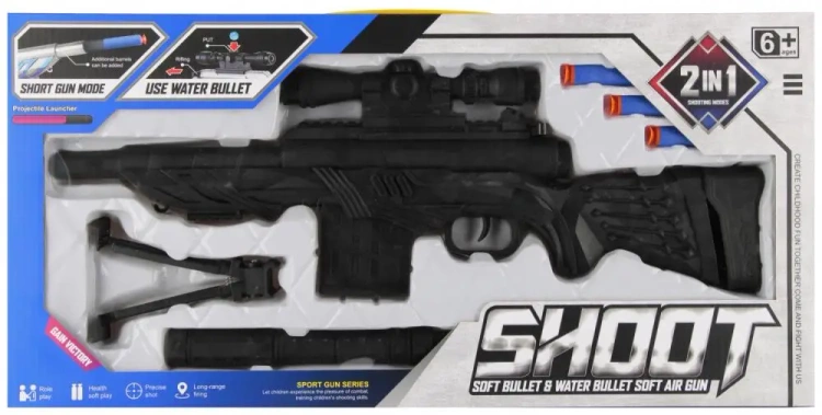 Zalety produktu Karabin na pocisk wodny i strzałki piankowe 2w1 to wyjątkowa zabawka 2w1, kt oacute ra gwarantuje podw oacute jną dawkę emocji Posiada możliwość strzelania zar oacute wno mocnym strumieniem wody, jak i miękkimi, bezpiecznymi strzałkami piankowymi, dzięki czemu świetnie sprawdzi się podczas zabawy na świeżym powietrzu i w domu. Lekka konstrukcja, ergonomiczny uchwyt i prosta obsługa sprawiają, że karabin jest wygodny i bezpieczny nawet dla młodszych dzieci. Solidne wykonanie zapewnia trwałość, a atrakcyjny design zachęca do zabawy w drużynowe pojedynki i letnie przygody. Strzałki/ pociski trzeba umieścić w magazynku - po naciśnięciu spustu, nastąpi wystrzał z pistoletu. Nie należy strzelać do zwierząt Zabawka wykonana z plastiku i pianki. Zawartość zestawu karabin, pociski wodne, 3x pociski piankowe. Wymiary/waga/baterie wymiary produktu dł. x wys. x gł. cm karabin 77x21x13, wymiary opakowania dł. x wys. x gł. cm 52x25x5, waga produktu bez opakowania kg 0,27 kg, waga produktu w opakowaniu kg 0,48 kg, nie wymaga zasilania bateriami. Zestaw przeznaczony dla dzieci w wieku 6 . Pakowany w karton z okienkiem. W kartonie po 48szt.