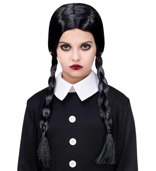 Peruka czarna z warkoczami to wyjątkowy dodatek, który pozwala stworzyć mroczny i efektowny wygląd na karnawał, Halloween lub imprezę tematyczną. Włosy mają głęboki czarny kolor z delikatnym połyskiem i ułożone są w dwa długie, proste warkocze z przedziałkiem na środku. Peruka mocowana jest na elastycznej siateczce, co zapewnia wygodne dopasowanie do głowy. Produkt w rozmiarze uniwersalnym doskonale sprawdzi się jako uzupełnienie stroju, nadając mu wyrazisty i tajemniczy charakter.