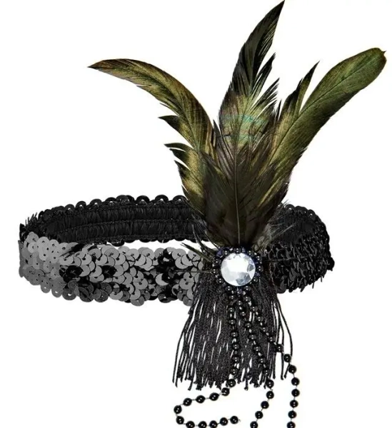 Na boku opaski znajduje się elegancka broszka ozdobiona piórami, koralikami oraz stylowym kamykiem, które nadają całości wyjątkowego charakteru i nuty artystycznego szyku. To idealny dodatek na wieczorne przyjęcia, tematyczne imprezy lub stylizacje inspirowane erą jazzu i wielkich Gatsby'ów.
