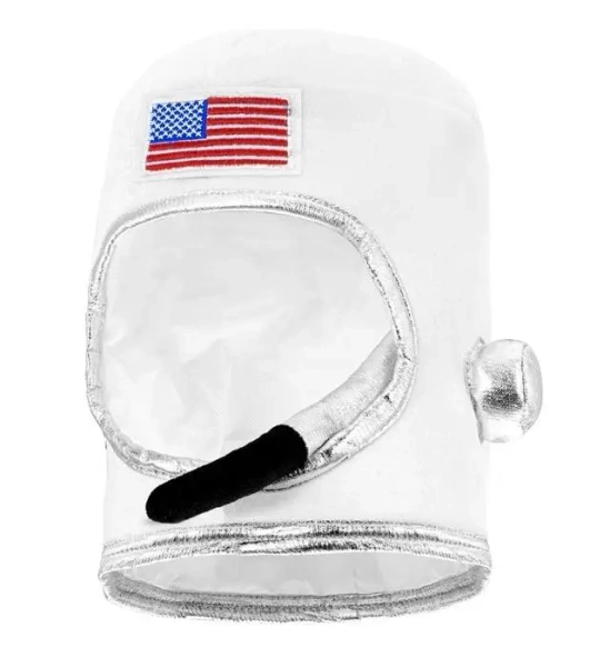 Czapka astronauty wykonana z miękkiego, pluszowego materiału w kolorze białym, wykończona srebrną lamówką, doskonale sprawdzi się zarówno dla dzieci, jak i dorosłych. Na czole znajduje się naszywka z amerykańską flagą, która nadaje całości autentyczny wygląd.
