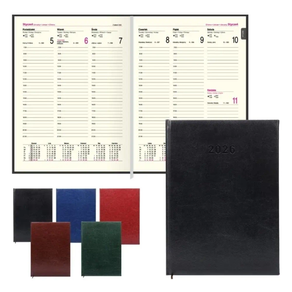 Kalendarz ma 112 strony i twardą, skóropodobną okładkę, która chroni wnętrze przed zniszczeniem, zapewniając jednocześnie elegancki wygląd. Układ środka jest niezwykle funkcjonalny - cały tydzień ma swoją stronę, a cała druga strona jest poświęcona na notatki, co ułatwia organizację i planowanie.
