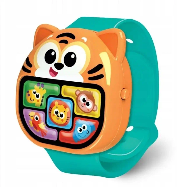 Kompaktowy towarzysz zabawy, uroczy tygrysek, to pierwszy zegarek malucha, który zamiast godzin, nauczy powitań dostosowanych do pory dnia! Zabawka wypowiada także inne, wesołe zwroty, a także odtwarza pięć różnych piosenek w języku polskim. Tygrysek wyposażony został w praktyczny, regulowany pasek do zapięcia na rączce oraz guziczek, znajdujący się z boku, który umożliwia wyłączenie zabawki.