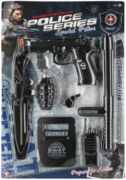 Zalety produktu rozwijanie wyobraźni dziecka poprzez różne scenariusze zabawy, nauka odróżniania dobra od zła, pistolety wydają efekty dźwiękowe po naciśnięciu spustu. Razem z zestawem MEGA CREATIVE łap przestępców. Pokaż odznakę a w razie ucieczki wystrzel ostrzegawczo w niebo Zawartość zestawu pistolet, nóż, granat, pałka, krótkofalówka, gwizdek i odznaka policyjna. Zabawki wykonane z plastiku. Wymiary/waga/baterie wymiary produktu dł. x wys. x gł. cm -pistolet 19x13x4, wymiary opakowania dł. x wys. x gł. cm 31x45x5, waga produktu bez opakowania kg 0,19 kg, waga produktu w opakowaniu kg 0,31 kg, nie wymaga zasilania bateriami. Zestaw przeznaczony dla dzieci w wieku 3 . Zestaw pakowany na blistrze. W kartonie po 42 szt.