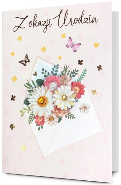 Kartka jest bogato i różnorodnie zdobiona (zależnie od wzoru: metaliczna folia, lakier perłowy,