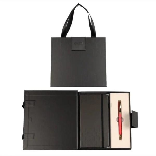 Zestaw prezentowy w ciekawym opakowaniu imitującym torebkę prezentową. Komplet zawiera notes z gumką i wstążką oraz elegancki czerwony długopis CLASSIC ze złotymi wykończeniami. Zestaw upominkowy spakowany w kartonowe etui z zapięciem magnetycznym. Po zamknięciu opakowanie przybiera postać torebki prezentowej z uchwytami ze wstążki. Zatem po zakupie jest to gotowy prezent do wręczenia na różne okazje.