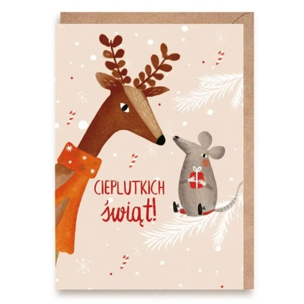Kartka świąteczna Cieplutkich Świąt z reniferem i myszką