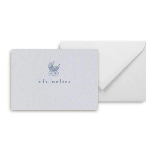 Niebieska mini kartka z napisem hello bambino to wyjątkowy akcent na powitanie małego chłopca.