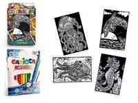 Zestaw 4 kolorowanek welwetowych, każda o wymiarze 18x12 cm, z 12 flamastrami Carioca w zestawie - idealny towarzysz podróży.