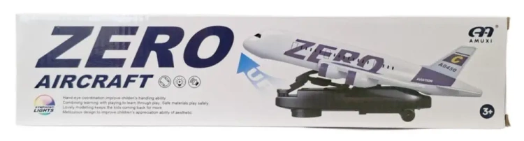 Samolot pasażerski z efektami świetlnymi i dźwiękowymi. Model w białym kolorze z nadrukiem, osadzony na podstawce. Produkt działa na baterie AA. Baterie nie są załączone do zabawki. Zabawka przeznaczona dla dzieci od lat 3. Zapakowana w kartonowe pudełko. Podane wymiary są wymiarami opakowania.
