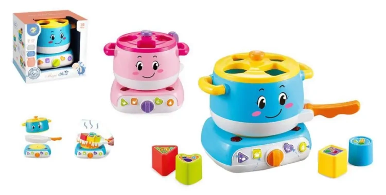 Interaktywny zestaw kuchenny – garnuszek do zabawy z funkcjami edukacyjnymi i klockami do sortowania kształtów. Naczynie świeci także kolorowym światełkiem i wydaje dźwięki (gotującej wody, kuchenki gazowej, gotującej zupy). Zabawka działa na baterie AA. Baterie nie są załączone do zabawki. Dostępny w dwóch wariantach kolorystycznych, kolor wybierany losowo. Cena dotyczy jednej sztuki. Produkt dla dzieci od 18 miesiąca życia. Zapakowany w kartonowe pudełko. Podane wymiary są wymiarami opakowani