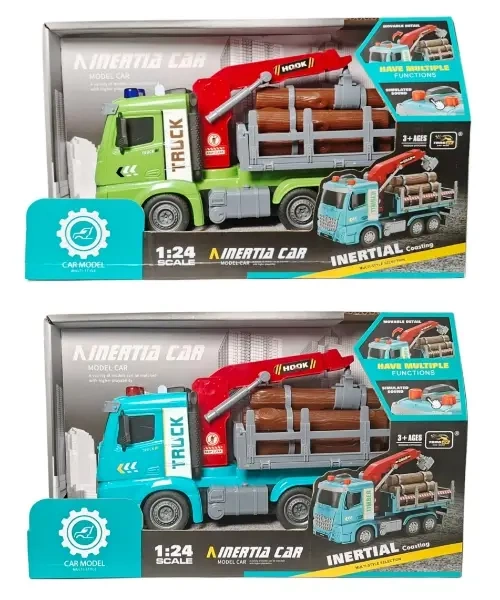Ciężarówka do przewozu drewna. Model z ruchomym ramieniem i pniami do załadunku. Ciężarówka świeci kolorowym światełkiem oraz wydaje dźwięki. Zabawka działa na baterie AG13. Baterie znajdują się w zabawce. Dostępne różne wersje kolorystyczne, kolor wybierany losowo. Cena dotyczy jednej sztuki. Zabawka przeznaczona dla dzieci od lat 3. Zapakowany w kartonowe pudełko. Podane wymiary są wymiarami opakowania.