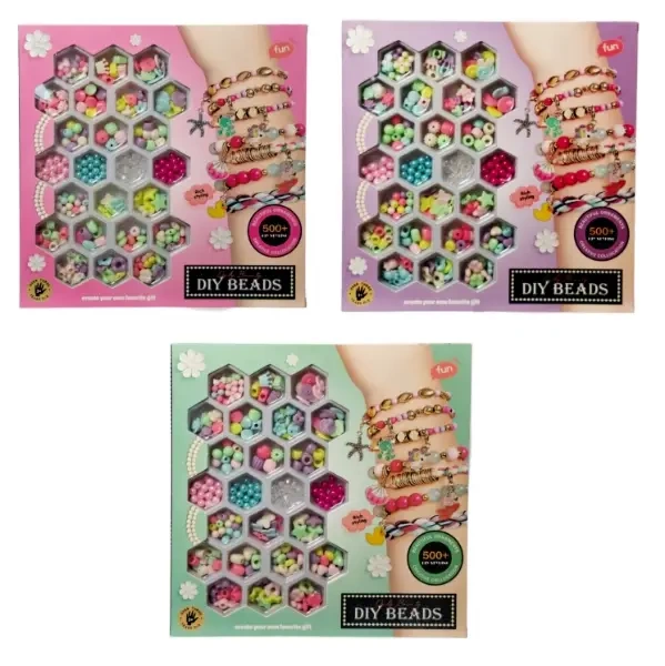 Zestaw koralików do tworzenia biżuterii. W komplecie ponad 500 elementów w różnych kolorach i kształtach. Dostępne różne warianty zestawów, wybierane losowo. Cena dotyczy jednej sztuki. Zapakowane w kartonowe pudełko. Podane wymiary są wymiarami opakowania.