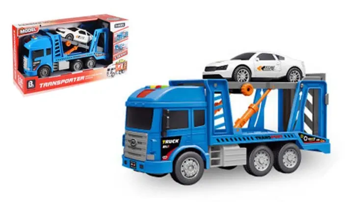 Samochód ciężarowy do przewozu aut. W zestawie znajduje się ciężarówka oraz samochód osobowy. Auto działa na baterie AAA. Baterie nie są załączone do zabawki. Zabawka przeznaczona dla dzieci od lat 3. Zapakowane w kartonowe pudełko. Podane wymiary są wymiarami opakowania.