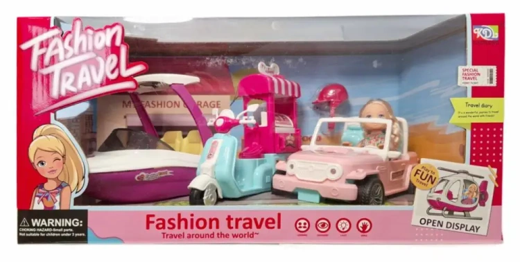 Zestaw lalka z pojazdami i akcesoriami. W komplecie samochód, skuter z cukiernią, łódka i dodatki do zabawy. Wybrane elementy zestawu działają na baterie typu AG13. Baterie znajdują się w zabawce. Zabawka przeznaczona dla dzieci od lat 3. Zestaw zapakowany w kartonowe pudełko. Podane wymiary są wymiarami opakowania.
