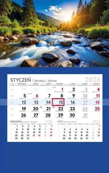 Kalendarz jednodzielny to funkcjonalny typ kalendarza biurowego. Czytelne, jednokartkowe kalendarium eksponuje miesiąc bieżący, a poniżej w mniejszej skali, miesiące poprzedni i następny.