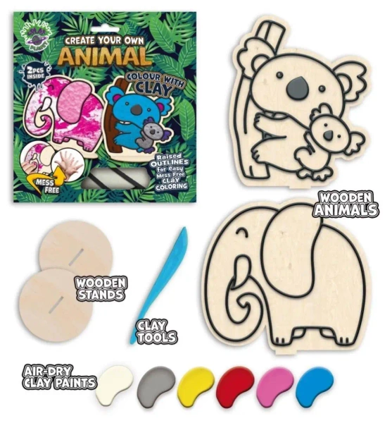 Zestawy do kolorowania z plasteliny na drewnianych szablonach z trójwymiarowym efektem. Umożliwiają stworzenie kolorowych figurek. Naniesione kontury stanowią wyraźny przewodnik, ułatwiając precyzyjne wypełnianie kolorową gliną. Dwie figurki