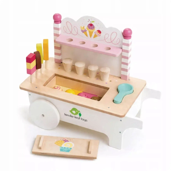Drewniany sklepik z lodami na magnesy, Tender Leaf Toys Otwórz swoją własną lodziarnię! Nasz drewniany sklepik z lodami pozwoli Twojemu maluchowi przygotować przeróżne lody dla całej rodziny! Do wyboru są 4 rodzaje lodów na patyku i 4 różne lody w rożku. Nakładaj lody za pomocą specjalnej łyżki. Dzięki ukrytym magnesom z łatwością nałożysz gałki lodów na rożki! Świetna zabawa i jednocześnie nauka kreatywnego odgrywania ról oraz opowiadania historii. Detale są dla nas bardzo ważne, dlatego nasz sklepik został wykonany z dbałością o każdy szczegół. Piękne pastelowe kolory i staranność wykonania sprawiają, że drewniany sklepik docenią zarówno najmłodsi, jak i rodzice. Nasze zabawki produkowane są z drzewa kauczukowego, pochodzącego z kraju położonego na 13 tysiącach rajskich wysp - Indonezji. Do ich pomalowania użyliśmy bezpiecznych i delikatnych farb, dzięki czemu drewno zachowało swój naturalny wygląd i widoczną strukturę. Drewno kauczukowe cechuje się wyjątkową wytrzymałością, co jest niewątpliwym atutem zabawek Tender Leaf Toys. W trosce o naturę, w miejsce każdego drzewa wykorzystanego do produkcji zabawek Tender Leaf Toys, sadzimy nowe drzewo. W Tender Leaf Toys dbamy o zrównoważony rozwój planety i ochronę środowiska naturalnego. Zabawki Tender Leaf Toys tworzone są z myślą o najmłodszych przez brytyjską projektantkę Danielle Hanson, która od lat związana jest z branżą dziecięcą. Dzięki jej doświadczeniu, pasji i niezwykłej wyobraźni, zabawki marki Tender Leaf Toys pięknie odwzorowują detale otaczającego nas świata, jak również dbają o rozwój zdolności manualnych i poznawczych dzieci. Wszystkie etapy produkcji zabawek Tender Leaf Toys odbywają się w jednym miejscu, z najwyższą dbałością o środowisko - w egzotycznej Indonezji, kraju słynącym z poszanowania dla własnej kultury i zasobów naturalnych. Zestaw zawiera: Wózek ** 4 lody na patyku ** 4 rożki ** 4 magnetyczne gałki lodów ** Łyżka do nakładania Produkt przeznaczony dla dzieci powyżej 3 lat. Wymiary zabawki: 37.5 x 19.3 x 31 cm Wymiary opakowania: 19.8 x 14.2 x 38.5 cm