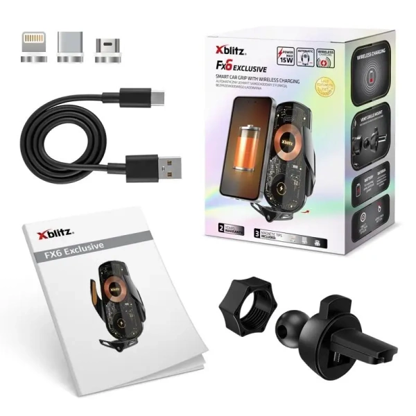 Xblitz FX6 Exclusive oferuje dwa sposoby ładowania - indukcyjne do 15 W i przewodowe z pomocą trzech magnetycznych końcówek dołączonych do zestawu. Automatyczne ramiona uchwytu reagują błyskawicznie na zbliżenie telefonu, a wbudowana bateria pozwala na ich otwarcie nawet bez zasilania. Minimalistyczna konstrukcja i surowe linie nadają mu nowoczesny, funkcjonalny charakter.