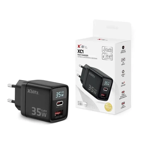 Odkryj ładowarkę Xblitz XC1 z technologią GaN3 - mniejszą, lżejszą i bardziej wydajną niż tradycyjne modele. Dzięki wyświetlaczowi LED zawsze wiesz, z jaką mocą ładuje się Twoje urządzenie. Wbudowane zabezpieczenia zapewniają pełne bezpieczeństwo, chroniąc podłączone sprzęty przed przegrzaniem, przeładowaniem i zwarciem. Dwa porty (USB-C PD35W i USB-A QC3.0 30W) umożliwiają jednoczesne zasilanie dwóch urządzeń, co czyni Xblitz XC1 idealnym rozwiązaniem dla każdego podróżnika.