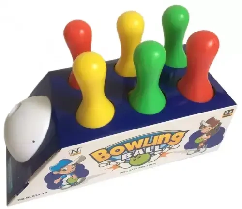 Zestaw do gry w kręgle. W skład zestawu wchodzi 6 kolorowych kręgli oraz jedna kula do ich zbijania. Kula posiada trzy małe wgłębienia imitujące oryginalne otwory na palce.
