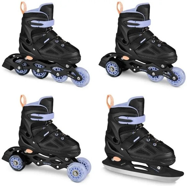 Rolki 4w1 rolki, wrotki, rolko-wrotki oraz łyżwy. Płoza rolkowa wykonana jest z aluminium, a płoza łyżwowa ze stali. Wyposażone są w szybki i niezawodny system regulacji rozmiaru oraz trzystopniowe zapięcie: klamrę, rzep, sznurowadła, które zapewnia pewne trzymanie stopy. Oddychający materiał oraz system wentylacji maksymalnie podnoszą komfort użytkowania, także dzięki wnętrzu wykończonemu aksamitem. Wyposażone w świecące w czasie jazdy, półprzeźroczyste kółka. Kształt i design buta podkreślony został kolorowymi przeszyciami oraz dwukolorowymi sznurowadłami. Parametry: - dwie płozy: łyżwowa oraz rolkowa z możliwością konfiguracji w trzech ułożeniach (rolki, wrotki, wrotko-rolki) - płoza rolkowa: aluminiowa - płoza łyżwowa: stalowa hokejowa - przednie kółko: świecące LED - kolorowe przeszycia i dwukolorowe sznurówki - zapięcia: klamra dwusekcyjna z zabezpieczeniem, rzep, sznurówki - norma: EN 13843 / 15638 - łożyska: ABEC 7 Carbon - kółka: PU - twardość kół: 82 A - maksymalna waga użytkownika: 60 kg - but: półmiękki z wentylacją - materiał zewnętrzny: poliester - materiał wewnętrzny: aksamit + pianka EVA - oddychający materiał - rozmiar kół: 64 mm (r. 30-33), 70 mm (r. 34-37), 72 mm (r. 38-41) - - Informacje dotyczące bezpieczeństwa: - Należy stosować środki ochrony indywidualnej. Nie nadaje się dla dzieci o masie ciała większej niż 60 kg. Do stosowania pod nadzorem osoby dorosłej. Nie używać w ruchu ulicznym. Nie do użytku komercyjnego.