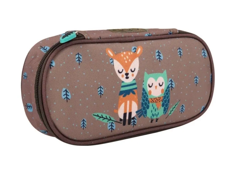 Piórnik Perletti z serii Cool Kids wykonany w kolorze brązowym to praktyczny i uroczy dodatek dla każdego ucznia. Całą powierzchnię zdobią ładne, rysunkowe nadruki sowy i liska oraz zielonych drzewek, które nadają piórnikowi wyjątkowy, przyjazny wygląd.