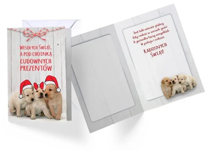 Kartka wielkości B6, zdobiona w zależności od wzoru metaliczną folią lub brokatem. Każda kartka posiada kolorowe życzenia w środku i koperte.