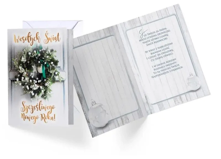 Kartka wielkości B6, zdobiona w zależności od wzoru metaliczną folią lub brokatem. Każda kartka posiada kolorowe życzenia w środku i koperte.
