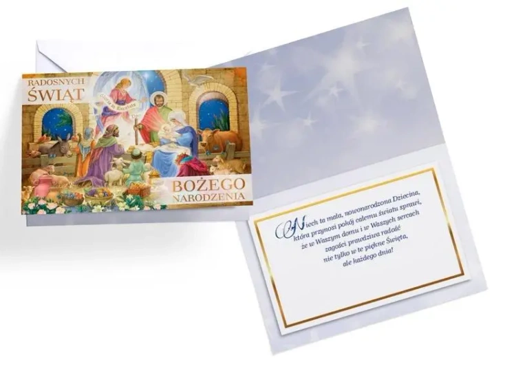 Kartka wielkości B6, zdobiona w zależności od wzoru metaliczną folią lub brokatem. Każda kartka posiada kolorowe życzenia w środku i koperte.