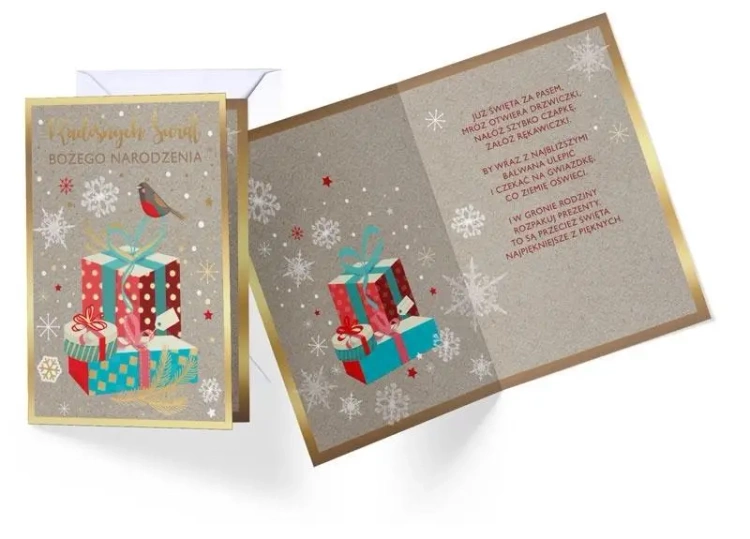 Kartka wielkości B6, zdobiona w zależności od wzoru metaliczną folią lub brokatem. Każda kartka posiada kolorowe życzenia w środku i koperte.