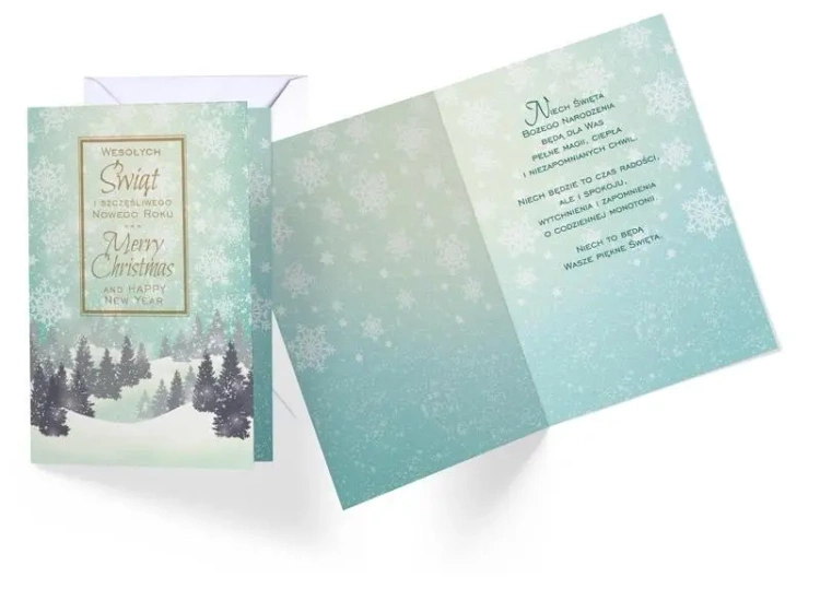 Kartka wielkości B6, zdobiona w zależności od wzoru metaliczną folią lub brokatem. Każda kartka posiada kolorowe życzenia w środku i koperte.