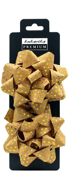 Kokardy wykonane z papieru kraft uszlachetnione dodatkowo metalizowanymi foliami.