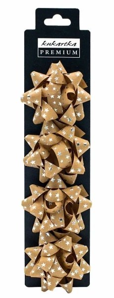 Kokardy wykonane z papieru kraft uszlachetnione dodatkowo metalizowanymi foliami.