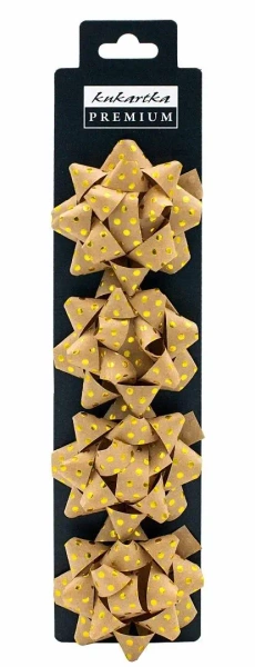 Kokardy wykonane z papieru kraft uszlachetnione dodatkowo metalizowanymi foliami.