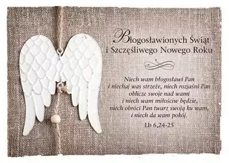 Tekst na kartce: Błogosławionych Świąt i Szczęśliwego Nowego Roku. Niech wam błogosławi Pan i niechaj was strzeże, niech rozjaśni Pan oblicze swoje nad wami i niech wam miłościw będzie, niech obróci Pan twarz swoją ku wam, i niech da wam pokój”. Lb 6,24-25