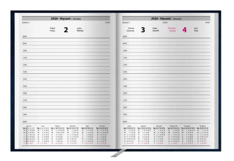 Kalendarz książkowy w twardej skóropodobnej oprawie ze wstążką. Układ kalendarium dzienny. 336 stron. Wymiary 143x211 mm