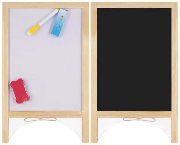 Cechy produktu: dwustronna tablica: magnetyczna i kredowa, stojąca, wygodna do użycia przez dzieci, rozwija kreatywność, motorykę i naukę liter i cyfr, bezpieczna i stabilna konstrukcja, odpowiednia dla dzieci od 3 roku życia.